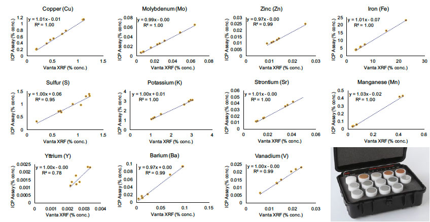 圖2. Vanta手持式XRF分析儀測(cè)量由OREAS提供的放于各種試劑盒中的斑巖銅和IOCG元素所獲得的數(shù)據(jù)與這些樣品的額定值高度吻合,表明了Vanta分析儀測(cè)量這些元素的出色性能。