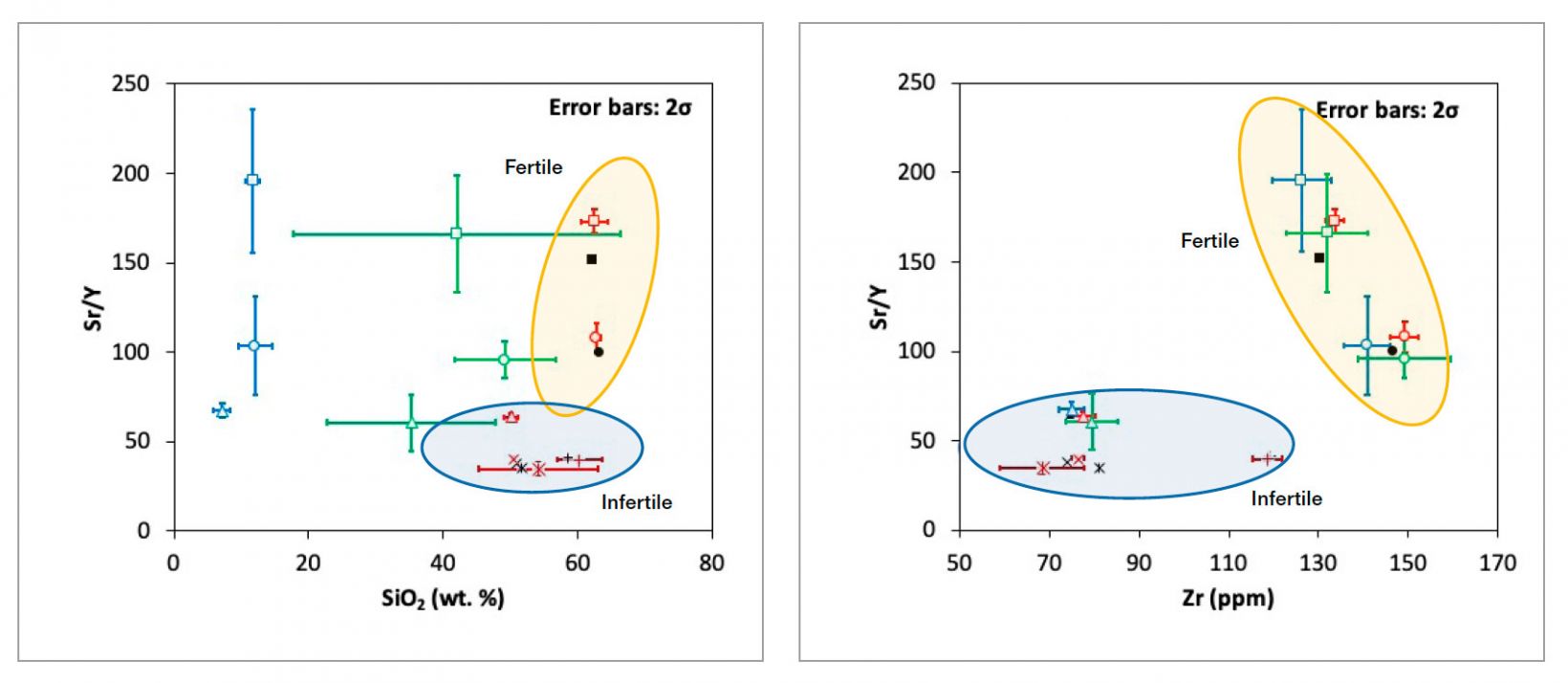 (a) Sr/Y對(duì)比SiO2的判別圖表,通常用作可開采潛力指示。