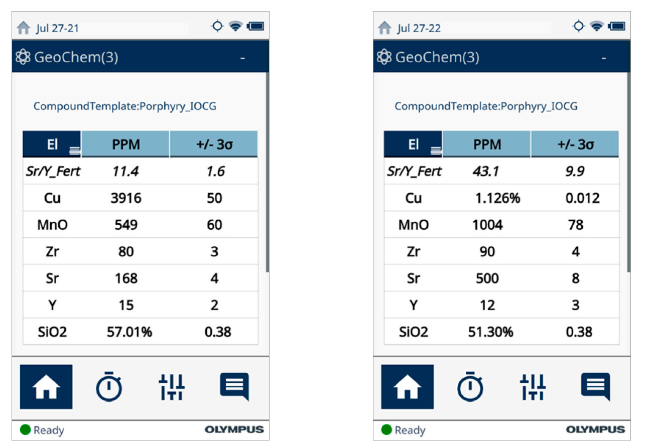 在實(shí)驗(yàn)室中測(cè)量的鍶(Sr)、釔(Y)、氧化錳(MnO)、二氧化硅(SiO2)和鋯(Zr)的不同比例組合可用于有效區(qū)分斑巖銅環(huán)境中的成礦特性和妨礙成礦的侵入體。最近,澳大利亞塔斯馬尼亞大學(xué)礦床和地球科學(xué)中心(CODES)和英國(guó)萊斯特大學(xué)地理、地質(zhì)和環(huán)境學(xué)院都對(duì)手持式分析儀在現(xiàn)場(chǎng)檢測(cè)制備好和未制備樣品以幫助勘探人員評(píng)估斑巖可開采性的能力進(jìn)行了研究。