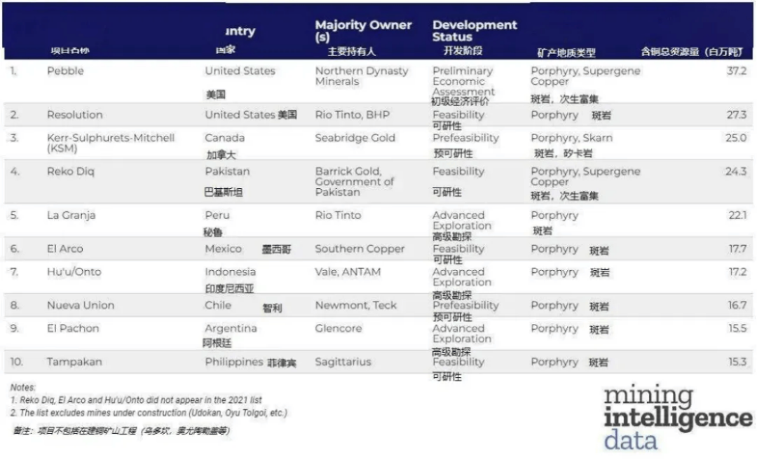 外媒Mining Intelligence根據三級(探明、推定和推測)資源量更新了世界十大未開發銅礦項目。前兩的未開發銅礦均位于美國。